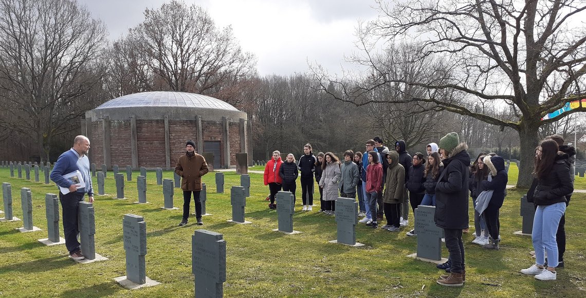 Abschließend gedachten wir in einer Schweigeminute den Kriegsopfern, die viel zu früh ihr Leben für die fanatische Ideologie des Nationalsozialismus geben mussten. Paarweise stellten wir anschließend jeweils eine Grabkerze auf und gedachten nicht nur den beigesetzten Soldaten und Zivilisten auf der Kriegsgräberstätte, sondern allen Opfern von Krieg und Verfolgung.